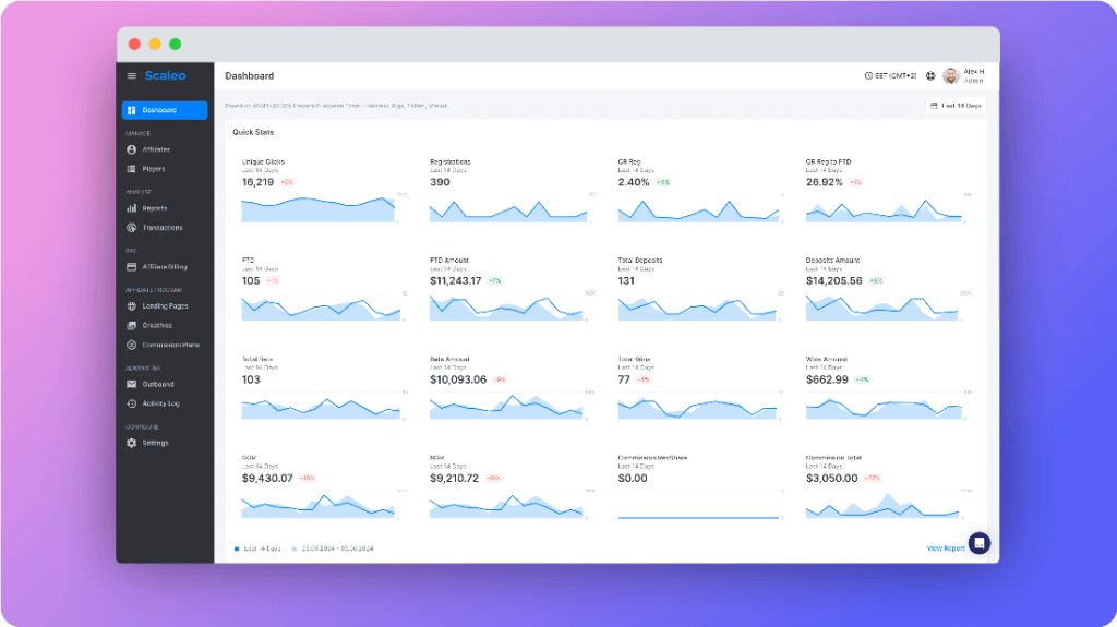 Scaleo’s Funnel Report and KPI & Player Reports make this visible at a glance: deposits, withdrawals, bonuses, bets, wins, GGR/NGR, and LTV by traffic source. That’s the difference between guessing and allocating.
